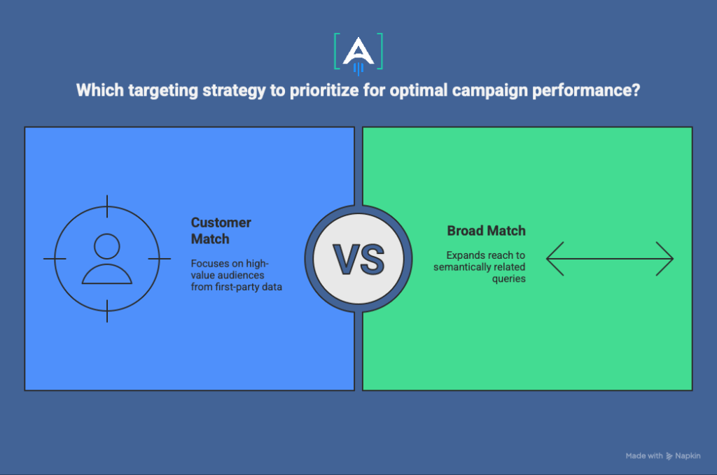 Combining Customer Match targeting with a broad match strategy is particularly effective. Customer Match enables the system to recognize high-value audiences from first-party data, while broad match expands the campaign’s reach to semantically related search queries.